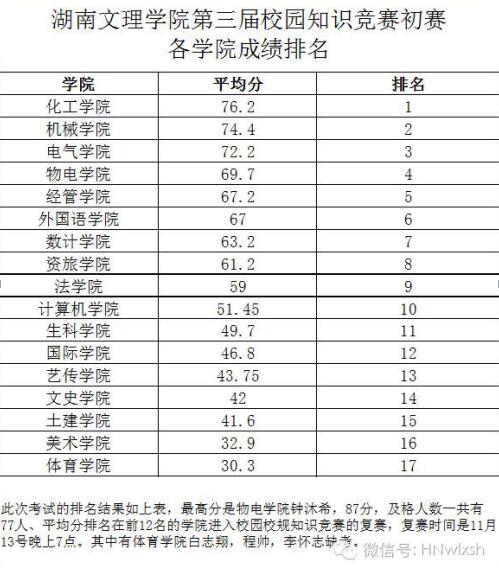 下面是湖文理学院第三届校园知识竞赛初赛各学院成绩排名,希望进入复赛的各个学院能够再接再厉,在接下来的比赛中取得好的成绩!