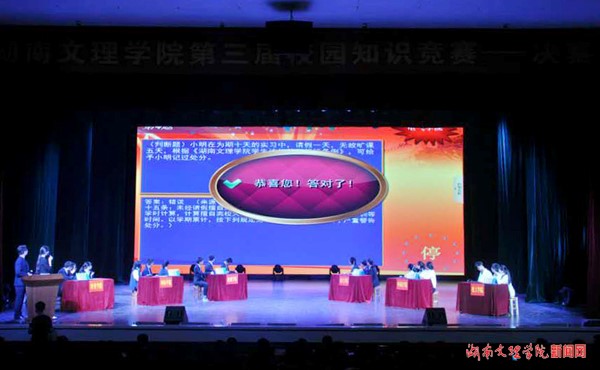 本网讯(记者 黄源 刘明珠) 11月27日晚,由湖南文理学院学工部主办,湖南文理学院学生会承办的湖南文理学院“八学期八主题”第三届校园知识竞赛决赛在演艺中心举办。此次竞赛,旨在贯彻落实《湖南文理学院学生综合素质提升工程实施意见》精神,进一步加强学生养成教育,帮助学生养成良好的思想品德和行为习惯,引导学生端正学习态度,养成正确的学习习惯。除了出席的评审,还有各学院学工办老师和学生干部及全体大一新生代表也观看了此次竞赛。