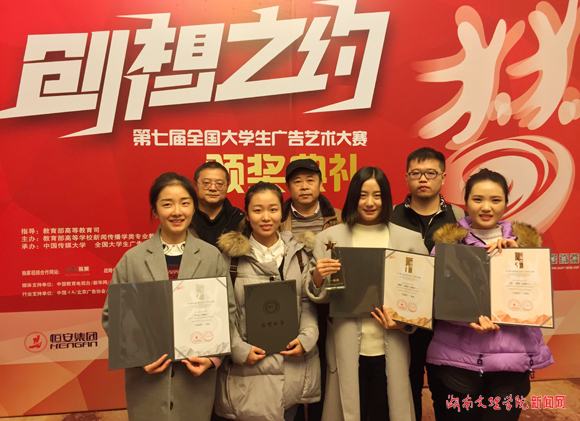 本网讯 11月21日,第七届全国大学生广告艺术大赛(以下简称“大广赛”)颁奖典礼在全国政协礼堂隆重举办,全国千名嘉宾代表、获奖师生齐聚北京,共襄盛举。在此次大赛中,我校美术学院师生作品荣获国家一等奖1件、国家二等奖1件、国家三等奖2件、优秀奖3件,获奖等级及获奖总数在湖南省同类院校中名列前茅。美术学院首次应邀参加该赛颁奖典礼。中国高等教育学会秘书长康凯、大广赛组委会主任丁俊杰教授先后在典礼上致辞。