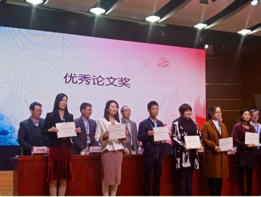 图为2018年度优秀论文二等奖获得者学工部张一弛老师(左二)上台领奖