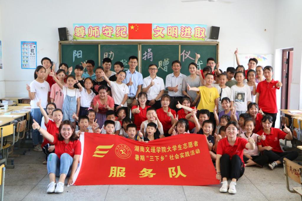 刘春晖一行先来到鼎城区谢家铺镇中学看望国际学院星火国际“三下乡”志愿者服务队的队员们,听取了志愿者给当地留守儿童上的一堂充满国际特色的《趣味英语歌曲》示范课。课后,刘春晖代表学校向谢家铺镇中学的留守儿童们赠送了学习用品,并鼓励孩子们奋发学习、自立自强、成长成才。