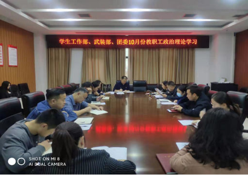本网讯(通讯员 宋英)为进一步提升教职工的政治素养和理论水平,充分发挥理论学习对工作的指导作用,10月25日下午4点,学生工作部、武装部、团委全体教职工在逸夫楼A205开展政治理论学习。会议由学生工作部、武装部部长胡芳毅主持。