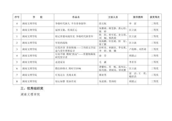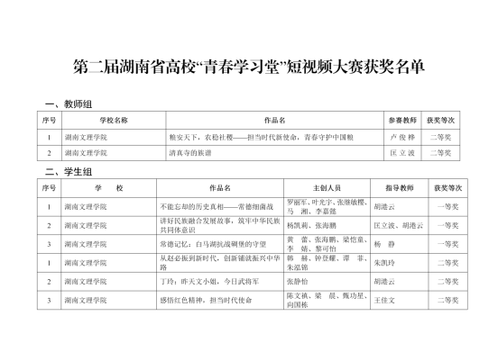 本网讯(文字 郭东林)近日,中共湖南省委教育工委、湖南省教育厅公布了第二届湖南省高校“青春学习堂” 短视频大赛评选结果,我校荣获优秀组织奖,教师组二等奖两项,学生组一等奖三项、二等奖五项、三等奖八项。