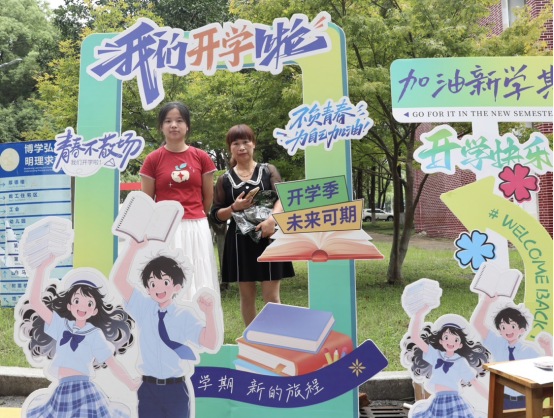 新生及其家长在迎新打卡点合影