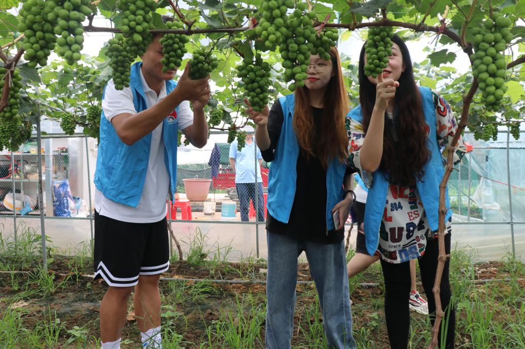 本网讯(通讯员 康蓉)6月9日,常德市澧县如东镇的“阳光玫瑰”葡萄园里出现一批身穿志愿者服的学生,周边村民们一打听才知道,原来是湖南文理学院国际学院的学子们正在开展劳动教育实践活动。