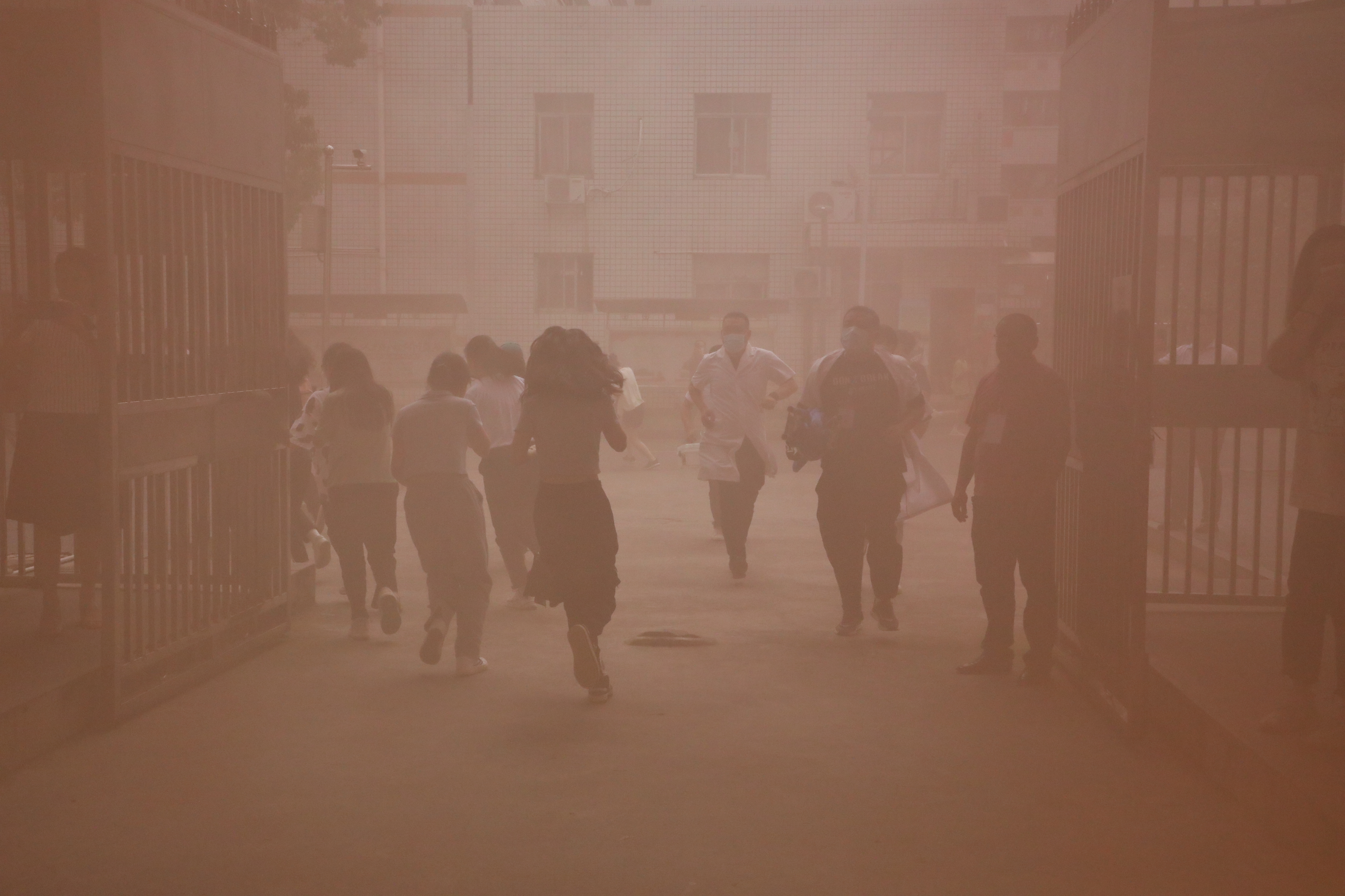 演练开始,师范公寓楼冒出一股股刺鼻的浓烟,警报声紧急响起,室内学生在老师引导下,弯着腰,捂住口鼻,迅速有序地按规定路线撤离,到达学生公寓六舍篮球场。消防队员紧随其后,将伤员送上救护车急救。