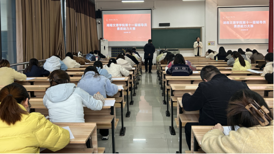 本网讯(文字 郭东林)近日,我校举办了第十一届辅导员素质能力大赛,旨在考察辅导员们的理论素养、业务技能、实践操作和现场应变等综合能力。邀请了湖南师范大学向发意老师、张小春老师,我校文史与法学学院凌云老师担任评委,各学院在岗一线专职辅导员参加比赛。